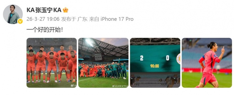 3月27日讯 在国足2-0击败库拉索后,张玉宁更新了个人社媒。